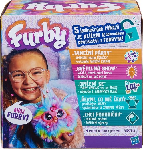 Interaktivní hračka, která mluví česky i „furbijsky“. Reaguje na 5 hlasových pokynů (s 3 dalšími unikátními režimy). Furby hraje hudbu v režimu Tanec. Pohyblivé nohy, oči a uši se světelnými efekty. Součástí balení jsou doplňky pro stylování a hraní. Pro provoz jsou potřeba 4ks baterie typu AA (nejsou součástí balení).