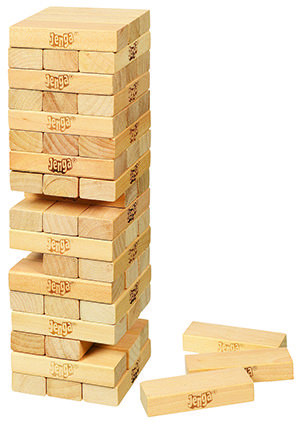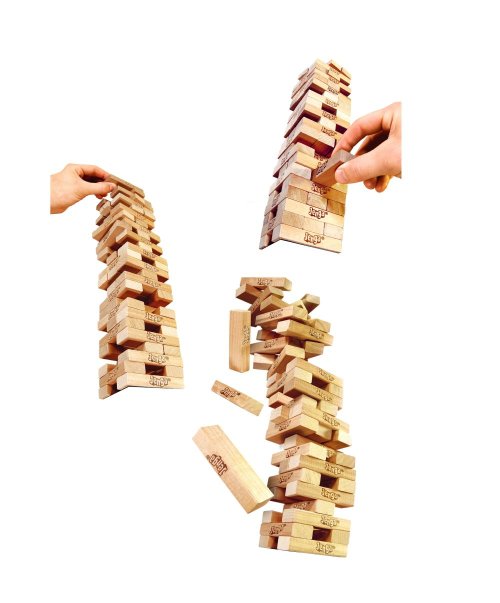 Postav ze všech kvádrů Jenga věž. Potom jednou rukou postupně vytahuj kvádry a umisťuj je nahoru, abys věž ještě zvýšil. Je tvá ruka dostatečně pevná, abys celou věž neshodil? Obsahuje 54 kvádrů Jenga z tvrdého dřeva a pomůcku na stavění.