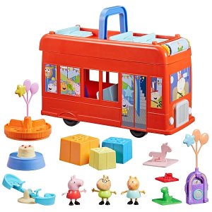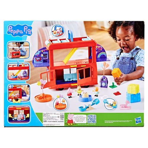 Připravte se na party dobrodružství s Peppa Party Busem 2 v 1! Představte si, že se Peppa a přátelé vydají na projížďku na střeše veselého dvoupatrového autobusu a najednou autobus proměníte do režimu party her a objevíte tři patra zábavy. Co budou figurky prasátka Peppa, Danny Dog a Candy Cat dělat dál? Co takhle taneční party na twirlingových platformách? Točení na kolotoči? Jízda na skluzavce? Je na dětech, aby pomocí 3 figurek a 13 doplňků s party tématikou připravily svojí vlastní party. Hračky Peppa Pig jsou skvělým dárkem pro děti, které milují tento seriál. Rozměry balení: 34,3 x 45,7 x 13,5 cm. Věk: 3+