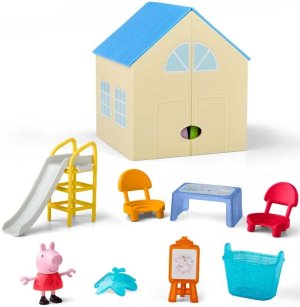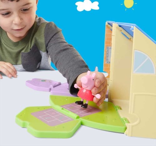 Pohyblivá figurka: 7,5 cm vysoká figurka má třpytivé červené šaty a může nosit masku, sedět na židličkách a sklouznout se po skluzavce. Školka a hriště: herní sada se otevírá a rozkládá tak, aby odhalila více herních ploch pro figurku Peppy. Vyprávějte příběhy: výtvarná výchova nebo skákání panáka? Hraní uvnitř nebo venku? Děti rozhodují! Skvělý dárek k prvnímu dni ve školce pro každého fanouška Peppy. 7 doplňků: uspořádejte stůl a židle a představujte si, jak Peppa vyrábí svou třpytivou motýlí masku! Nechybí ani stojan s tabulkou, košík a skluzavka. Uložení dílů: až hraní skončí, děti mohou domeček zavřít a uložit všechny dílky dovnitř.