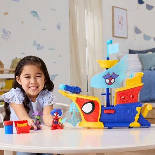 Děti si mohou představovat dobrodružství na moři s herní sadou Spidey and his Amazing Friends – Pirátská loď Webs Ahoy s bublinkami. Herní set obsahuje past na bubliny, otáčivý stožár a pozorovatelnu, výsuvné prkno a další prvky. Součástí sady jsou pohyblivé figurky superhrdinů Spideyho a Green Goblina o velikosti 7,6 cm s odnímatelnými doplňky – včetně: 2 pirátských klobouků, 1 páru pirátských bot, truhly s pokladem, mapy, lahvičky s bublinkovou tekutinou a dalších doplňků. Po použití stačí pirátskou loď s bublinkami jednoduše opláchnout a důkladně vysušit (podrobnosti viz návod). Obsahuje: 2 figurky, loď, 9 doplňků a bublinový roztok 30 ml. Vyrobeno z kvalitního plastu. Baleno v krabičce. Rozměry balení: 34,3 x 45,7 x 13,5 cm. Věk: 3+