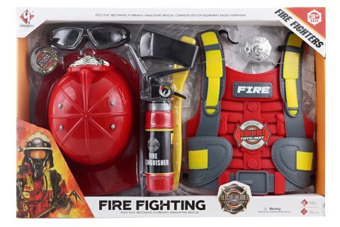 Hasičská sada obsahuje helmu, brýle, hasičský přístroj, sekyru, odznak a vestu. Rozměry vesty 26x32 cm (vzadu na gumičky). Materiál plast. Baleno v otevřené krabici. Rozměry balení 59x40x5,5 cm. Věk 3+