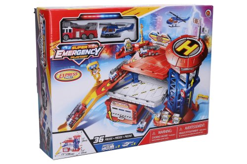 Hasičská stanice garáž. Velikost 38cm. Obsahuje hasičské auto vrtulník., výtah, nájezdy, garáž s vyklápěcími vraty nálepky, obrázkový návod na složení stanice. Garáž má 2 podlaží.