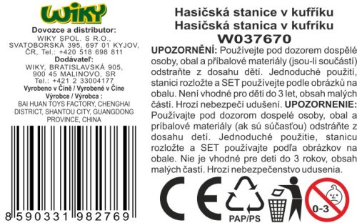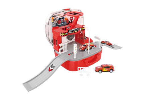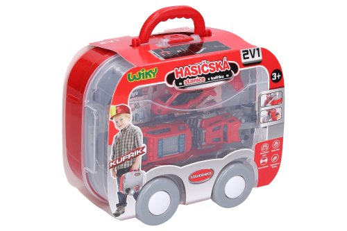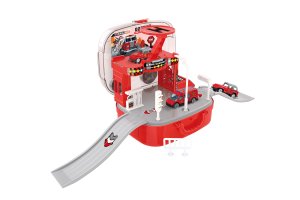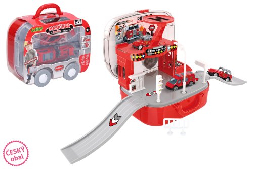 Hasičská stanice v kufříku. Rozměry 44x17x19 cm, velikost auta 7 cm. Součástí 2 auta, 1 vrtulník. Manuální výtah.