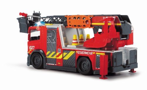 Hasičské auto Scania na volnoběh, se světelnými a zvukovými efekty a stříkací funkcí. Výsuvný žebřík a stabilizační opěry, nosítka, otevírací boční panely. Délka 35 cm