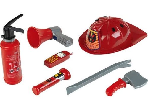 Dětská sada pomůcek vhodná pro malé hasiče. Sada obsahuje 7 kusů – helma, hasičák, svítilna na baterie 1,5V AA R6 (nejsou součástí), páčidlo, sekera, megafon dětský na baterie 1,5V AA R6 (nejsou součástí) a mobilní telefon. Vhodné pro děti od 3 let.