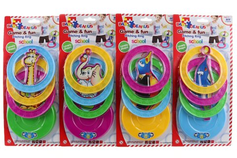 Házecí kroužky, motiv zvířátek. Balení obsahuje základnu a 3 kroužky. Materiál plast. Baleno na kartě. Rozměry balení 17,5x38x2,5 cm. Více druhů - dodáváme dle skladové dostupnosti. Věk 3+