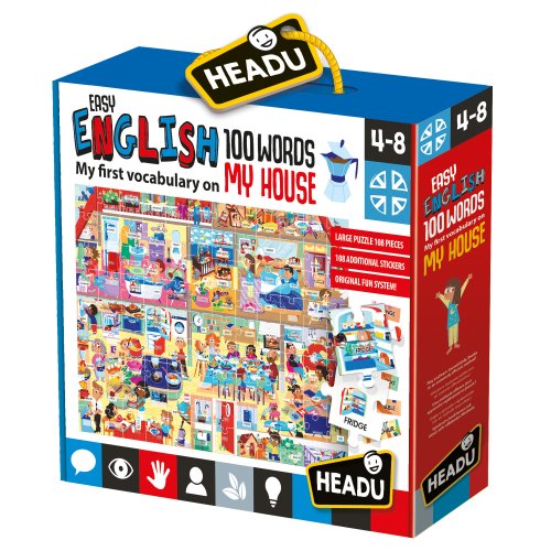 Velké puzzle se speciálními dílky pro výuku angličtiny už pro malé děti. Tato sada, vyrobená z odolných materiálů, obsahuje obří puzzle a více než 100 samolepek, které mohou být nalepeny a opět sejmuty. To vše podporuje učení se spousty slov spojených s domem plným barev. Správná výslovnost je podpořena speciálně vytvořenou aplikací.