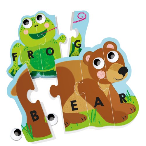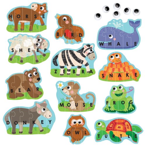 Sestavte zvířátka a naučte se číst! Sestavte dohromady samo-opravné puzzle a naučte se, jak číst a psát svá první slova. Navíc můžete vylepšit a oživit zvířátka přidáním nalepovacích očí.