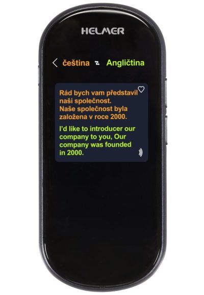 S hlasovým překladačem Helmer OTR 212 se dorozumíte cizím jazykem rychle, jednoduše a bez desítek hodin strávených v učebnicích. Tento model se vyznačuje obousměrným zvukovým překladem, který umožňuje komunikaci až ve 109 jazycích. Inovovaný model navíc dovoluje vložit 4G SIM kartu a překladač využít naprosto všude, kde je dostupný mobilní signál operátora, a to včetně mobilní datové sítě. Kromě toho umožňuje hlasový překladač Helmer OTR 212 bezdrátové připojení skrze síť Wi-Fi, takže převádět mluvený text nebo řeč do cizího jazyka můžete zcela neomezeně. Namluvený text je interpretován s dikcí a přízvukem rodilého mluvčího, aby nedošlo k nechtěnému komunikačnímu šumu. Totožný postup – tedy namluvení řeči nebo textu – použije i druhá osoba.