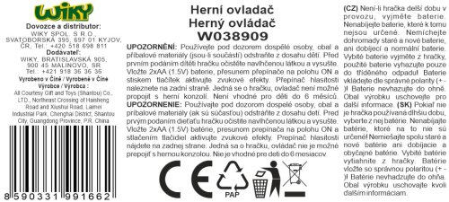 Herní ovladač. Rozměry 14,5x11 cm. Světelné a zvukové efekty. 2xAA baterie součástí. Přepínač ON/OFF na horní straně, přepínač hlasitosti na zadní straně ovladače.
