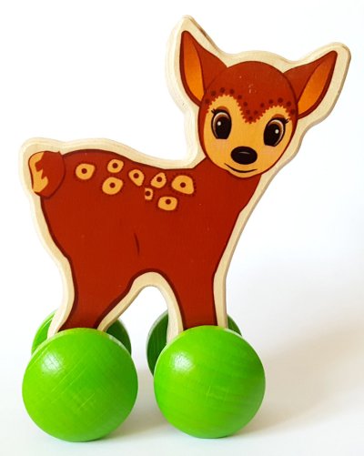 Dřevěná hračka jelena na kolečkách. Hlavní vlastnosti: veselá hračka pro rozvoj motoriky a koordinaci pohybů