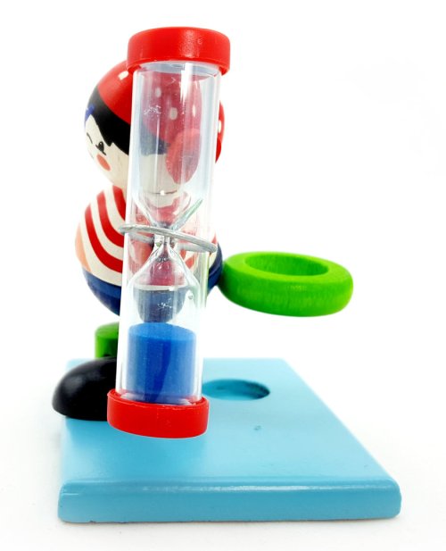 Díky těmto přesýpacím hodinám je čištění zubů ještě zábavnější. Délka přesýpání je 2 minuty. Za tělem piráta je úchyt - držák pro zubní kartáček. Hlavní vlastnosti: s držákem na zubní kartáček doba přesypávání 2 minvelikost 9 cm vyrobeno z původních neošetřených dřev