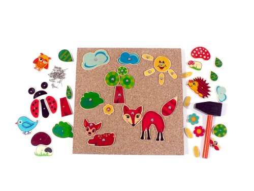 S touto zatloukací hrou se nebudete nudit. Použité barvy a tvary stimulují představivost. Tvořte rozmanité obrazy a cvičte jemnou motoriku Vašeho dítěte. Součástí sady jsou tvarové dílky z tištěné překližky, dřevěné kladívko, korková podložka a 50 ks hřebíčků s velkou půlkulatou hlavičkou. Hlavní vlastnosti: kompletní sada bezprostředně připravená ke hřevyrobeno eticky z ekologicky obhospodařovaných lesůpoužity ekologické a odolné barvy