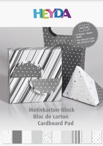 Blok barevných papírů, 10 motivů ve 2 gramážích, převážně oboustranně potištěny. Gramáže papírů 100 a 220 g/m2