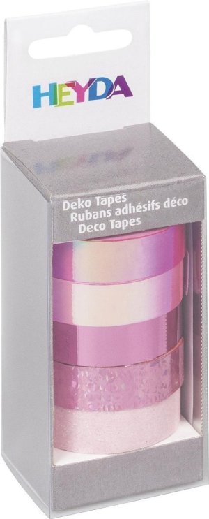 Balení obsahuje 5 kusů lepicích papírových pásek s lesklým, holografickým a duhovým efektem. Balení obsahuje 4 role 5m x 12mm a 1 glitrová (třpytivá) role 2m x 12mm.