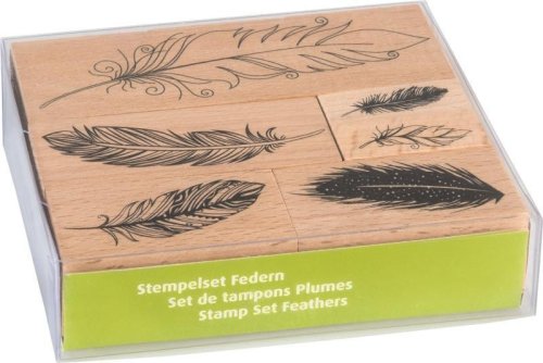 Sada razítek 6 ks s motivem peříček. Díky hluboké gumové textuře lze razítka použít na papír, textil, polymery i jiné povrchy. Jsou vhodná pro všechny druhy inkoustů. Po skončení práce opláchněte teplou vodou. Rozměry razítek jsou 1,5 x 4 cm až 4 x 12 cm.