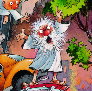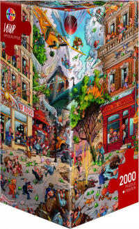 Puzzle od karikaturisty Loupa balené v netradiční trojboké krabici, která obsahuje plakát jako předlohu pro skládání.