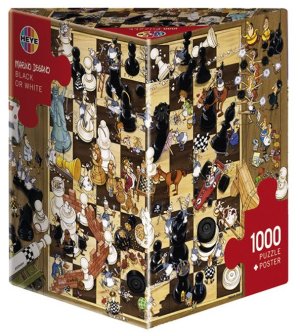 Puzzle od karikaturisty Marina Degana balené v netradiční trojboké krabici, která obsahuje plakát jako předlohu pro skládání.
