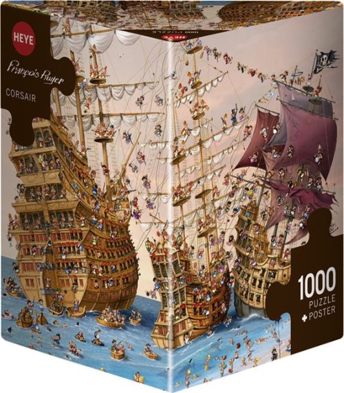 Puzzle od karikaturisty Francois Ruyera balené v netradiční trojboké krabici, která obsahuje plakát jako předlohu pro skládání.
