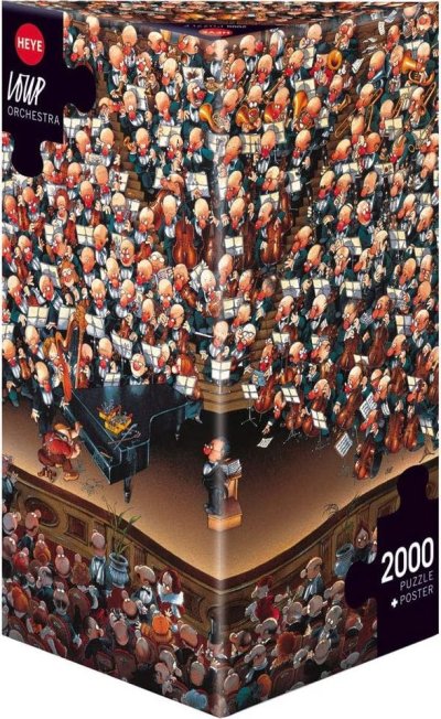 Puzzle od karikaturisty Loupa balené v netradiční trojboké krabici, která obsahuje plakát jako předlohu pro skládání.