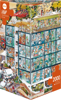 Puzzle od karikaturisty Loupa balené v netradiční trojboké krabici, která obsahuje plakát jako předlohu pro skládání.