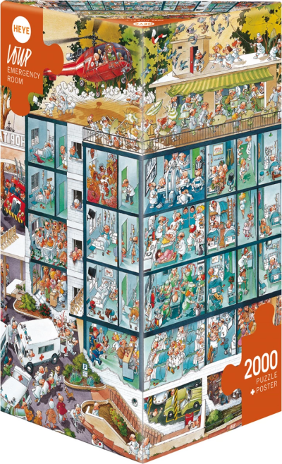 Puzzle od karikaturisty Loupa balené v netradiční trojboké krabici, která obsahuje plakát jako předlohu pro skládání.