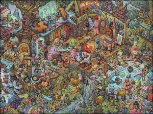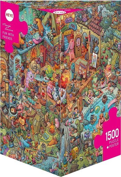 Puzzle od karikaturisty Marija Tiurina balené v netradiční trojboké krabici, která obsahuje plakát jako předlohu pro skládání. Rozměr složeného puzzle cca 80 x 60 cm