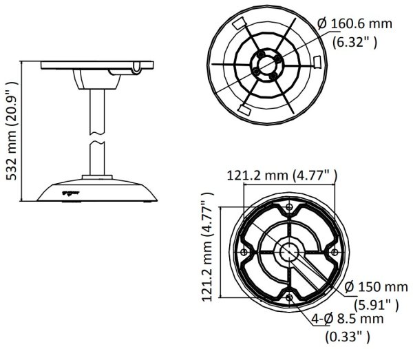 Stropní držák pro PTZ kamery Hikvision HWP-P332ZI-DE3. Zeď musí unést více než 3krát větší hmotnost, než je celková hmotnost kamery a držáku.