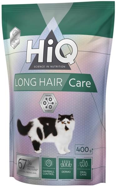Kompletní krmivo HiQ pro dospělé dlouhosrsté kočky je správná volba pro dokonalou péči o dlouhou srst vaši kočky. Vhodné pro kočky starší než 1 rok. Komponenty krmiva pomáhají zachovat lesk a hustotu srsti a dále dbají na zdraví pokožky. Odstraňují hrudky srsti nahromaděné v žaludku. Napomáhají k posílení dásní a snížení rizika tvorby zubního kamene. Krmiva HiQ nové generace byla vytvořena podle speciální receptury, jejímž základem je vědecký pokrok a bohatství přírody. NanoAgent Krmiva HiQ obsahují přírodní minerální látku ve formě nanočástic, které se říká NanoAgent. Ve chvíli, kdy se živiny v organismu dostanou do kontaktu s látkou NanoAgent, začnou se pohybovat rychleji, což vede k lepšímu zažívání a jejich účinnějšímu vstřebávání. Čistý kokosový olej Krmiva HiQ pro dospělá zvířata jsou obohacena přírodním a blahodárným čistým kokosovým olejem. Tento olej pomáhá optimalizovat metabolismus zvířat a zlepšuje stav jejich zažívacího traktu. Čistý kokosový olej také příznivě ovlivňuje kůži a srst a chrání před infekcemi a chorobami. Tato přísada stimuluje aktivitu mozku a mimořádně tak prospívá domácím mazlíčkům ve vyšším věku. Přírodní přísady a antioxidanty Krmiva HiQ obsahují velké množství přírodních složek, jako jsou sušené brusinky, lněná semínka, sušený měsíček, zelený čaj, výtažek z juky a řada dalších. Přírodní antioxidanty – výtažky z rozmarýnu a tokoferol z rostlinného oleje, spíše známý jako vitamín E – chrání krmiva před zkažením a oxidací. Složení: Drůbeží maso 38 % (sušené a jemně mleté), rýže, kukuřice, drůbeží tuk, kukuřičný lepek, rybí moučka, cukrovkové řízky, celulóza, lněné semínko, pivovarské kvasnice, kokosový olej (1%), dynamicky mikronizovaný klinoptilolit (1%), sušená vejce, extrakt z čekanky, extrakt juky, chlorid draselný, manano-oligo-sacharidy (MOS), pupalkový olej, moučka z měsíčku. Analytické složky: Hrubý protein 30 %, hrubý tuk 20 %, hrubá vláknina 4,1 %, hrubý popel 6,2 %, vápník 1 %, fosfor 0,8 %, draslík 0,7 %, sodík 0,5 %, omega-3 mastné kyseliny 0,43 %, omega-6 mastné kyseliny 3 %. Doplňkové látky/1 kg: nutriční d.l.: vitamín A (3a672a) 25000 m.j., vitamín D3 (3a671) 1876 m.j., vitamín E (3a700) 688 mg, kyselina listová (3a316) 2,5 mg, biotin (3a880) 1,9 mg, niacin (3a314) 94 mg, vitamín B6 (3a831) 5 mg, vitamín B1 (3a821) 6,25 mg, cholinchlorid (3a890) 1562 mg, síran železnatý (3b103) 62,5 mg, jodičnan vápenatý (3b202) 1,88 mg, síran měďnatý (3b405) 6,25 mg, síran manganatý (3b503) 25 mg, síran zinečnatý (3b605) 144 mg, seleničitan sodný (3b801) 0,13 mg, taurin (3a370) 1250 mg, L-karnitin (3a910) 100 mg. Technologické d.l.: extrakt rozmarýnu, tokoferolové extrakty z rostlinných olejů (1b306(i)). Dávkování: