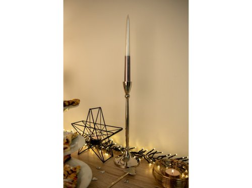 Hliníkový svícen o rozměru 90 × 280 mm je určen pro kónické svíčky. Minimalistický design zajišťuje stabilitu a bezpečné svícení. Svícen je vhodný pro stolní aranžmá, parapet nebo jako samostatná dekorace. Elegantní stříbrná barva dodává interiéru svěží a čistý vzhled.