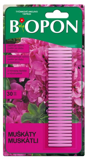 Vícesložkové hnojivo ve formě tyčinek je určeno pro muškáty. Obsahuje zvýšenou dávku draslíku a fosforu, která rostlinám zajišťuje intenzivní růst a bohaté kvetení , krásnou barvu květů a listů. Rostliny jsou poté odolnější vůči větru a lehkému mrazu. Tyčinky se rozpouští postupně - vyživují rostliny až 2 měsíce.