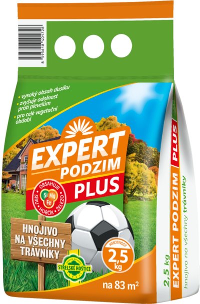 Hnojivo EXPERT PODZIM je granulované hnojivo, vhodné pro podzimní a pozdní podzimní hnojení všech druhů trávníků. Vysokým obsahem draslíku se zabezpečí vysoká odolnost trávníku proti vymrzání a napadení houbovými chorobami, které se šíří hlavně pod sněhovou pokrývkou. Použitím tohoto hnojiva na začátku léta (červen), se zvýší odolnost trávníku proti suchu v průběhu letních měsíců. Jemná granulace, potlačování mechu v trávníku.