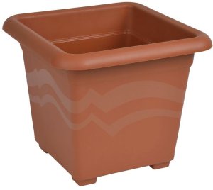 Květník čtvercového půdorysu s hladkým povrchem a nožičkami umožňujícími odtok vody.