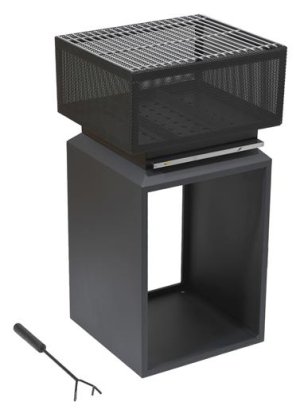 Přenosné ohniště na dřevo, čtvercová konstrukce z kvalitní oceli, vysokoteplotní černý nátěr, úložný prostor na dříví pod ohništěm, vysouvací popelník pro lehké čištění, ocelový rošt na grilování.