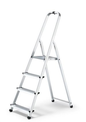 Typ - 1x4 jednostranné s madlem Pevná 4-stupňová žebříková konstrukce s jednostranným vstupem Bezpečné madlo 60 cm Široká pracovní plošina 25 cm x 26 cm Vroubkovaná plocha schůdků.
