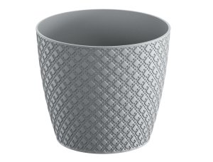 Matná plastová žardinka se vzhledem připomínajícím svetr na třech nožičkách v dekoru dřeva.