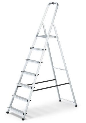 Typ - 1x7 jednostranné s madlem Pevná 7-stupňová žebříková konstrukce s jednostranným vstupem Bezpečné madlo 60 cm Široká pracovní plošina 25 cm x 26 cm Vroubkovaná plocha schůdků.