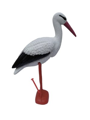Věrohodně zpracovaná zahradní dekorace v podobě čápa.