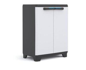 Skříň s 2 nastavitelnými policemi, ideální na terasu, do pergoly, dílny nebo na zahradu, odolnost vůči vodě, UV záření, povětrnostním podmínkám, recyklovaný plast, ergonomická madla.