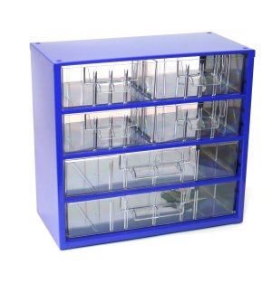 Skříňka 2 velikosti, 2 střední, 1 velká zásuvka, 30,5 x 15 x 15,5 cm, kov.