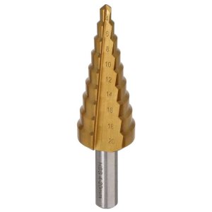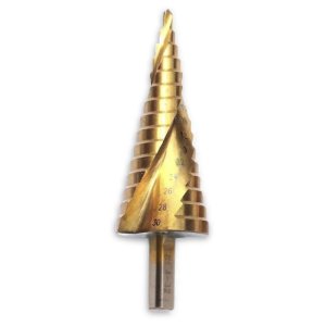 stupňovitý vrták z kvalitní HSS oceli DIN 1412C s TiN vrstvou vrstva TiN zvyšuje odolnost a životnost vrtáku použití: pro vrtání slitin a ocelových plátů do tloušťky 4 mm, plastu a dřeva široké drážky …