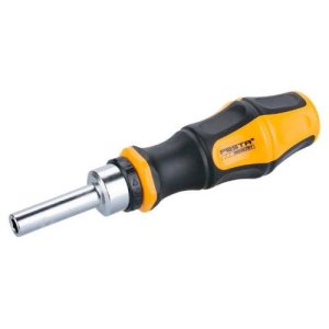 Ráčnový šroubovák s držákem bitů 1/4, CrV, ergonomická dvoukomponentní měkčená rukojeť, otvor pro páku, magnetická koncovka.