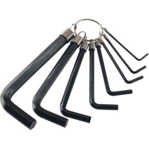 materiál: ocel sada obsahuje: 8 ks od 2 až 10 mm Sada nejpoužívanějších rozměrů šestihranných klíčů, tvrzených v celé délce, jenž jsou zavěšené pružnými závěsy na kroužku.