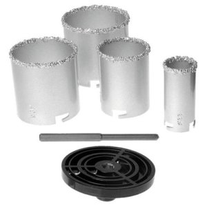 sada vykružovacích korunek korunka s karbidovým ostřím pro čisté a přesné vrtání průměry korunek: 33; 53; 67; 73 mm univerzální ALU unašeč speciální vodící vrták v sadě 6 ks