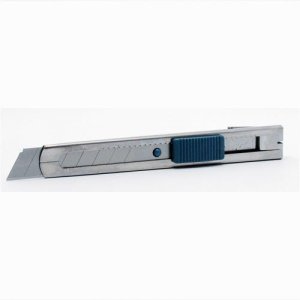 Kovový nůž s výsuvnou lichoběžníkovou čepelí - ergonomický tvar s pogumovanou rukojetí - výklopný zásobník na náhradní čepele Čepel je uchycena uvnitř těla nože na posuvném jezdci.