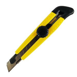 Pevný a odolný odlamovací nůž, břit o šíři 9 mm, uložen v kovovém pouzdře.