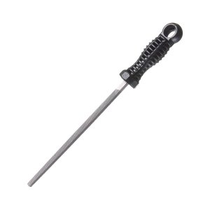 Kulatý pilník určený k ostření řezného zubu na pilovém kotouči motorové pily.