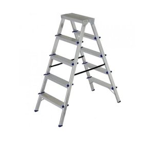 Oboustranné hliníkové schůdky EUROSTYL Al 5 (1081 mm), 2×5 stupňů, lehká a stabilní konstrukce, protiskluzové nášlapy, bezpečnostní popruhy, výška 1,08 m, hmotnost 4,94 kg.