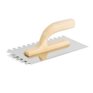 hladítko nerezové 270 x 130 mm - zub buková, lakovaná, ergonomická rukojeť nerezový, kyselině odolný plech tl. 0,7 mm nanášení lepidel, velikost zubů proporcionálně k velikosti obkladaček